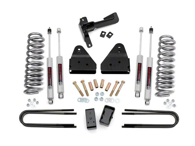 Enhanced Lift and Control. The Rough Country Suspension Lift Kit offers a 3-inch lift, improving ground clearance and accommodating tires up to 34 inches. Specifically designed for 2008-2010 4WD 6.4L Powerstroke F-350 Super Duty SRW models, this kit maintains stock handling and drivability for a smoother ride.