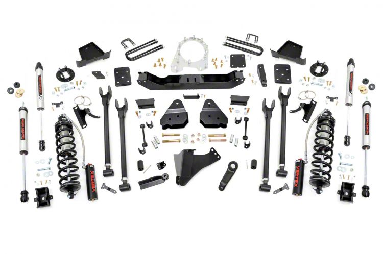 Durable Components. Rough Country’s 6" 4-Link Coilover Conversion Lift Kit features top-mounted reservoir brackets and coil-over mounts constructed from 1/4-inch steel. Utilizing this conversion kit you're removing the factory independent coil shock and coil set-up and replacing it with a massive 2.5in piston, nitrogen-charged, 8-stage adjustable Vertex Coilover. Rough Country’s Vertex Coilovers feature a monotube design with an external reservoir for increased oil capacity and damping sensitivity. When it comes to investing in a high-end kit, you’ll be pleased to find that Rough Country’s 2.5in piston design is beefier and offers an impressive 56% greater fluid capacity than the average reservoir shock. Each kit is paired with a monotube shock that provides optimal damping control.