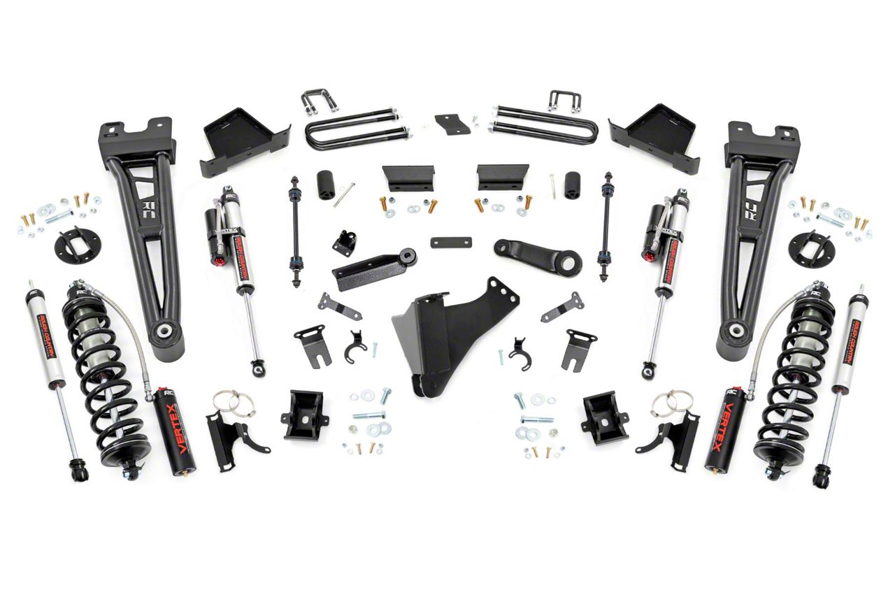 High-Performance Coil-Over Lift Solution. The Rough Country 6-Inch Coil-Over Conversion Radius Arm Suspension Lift Kit with Vertex Adjustable Shocks transforms your 2023 to 2026 F-350 Super Duty SRW (excluding Tremor) into a high-clearance, off-road-ready powerhouse. Engineered for superior ride quality and aggressive stance, this system allows fitment of up to 37-inch tires while optimizing suspension travel, geometry, and ground clearance. Vertex 2.5-inch coilovers paired with secondary V2 monotube shocks at each front corner offer customizable, precision-tuned suspension control in any terrain.