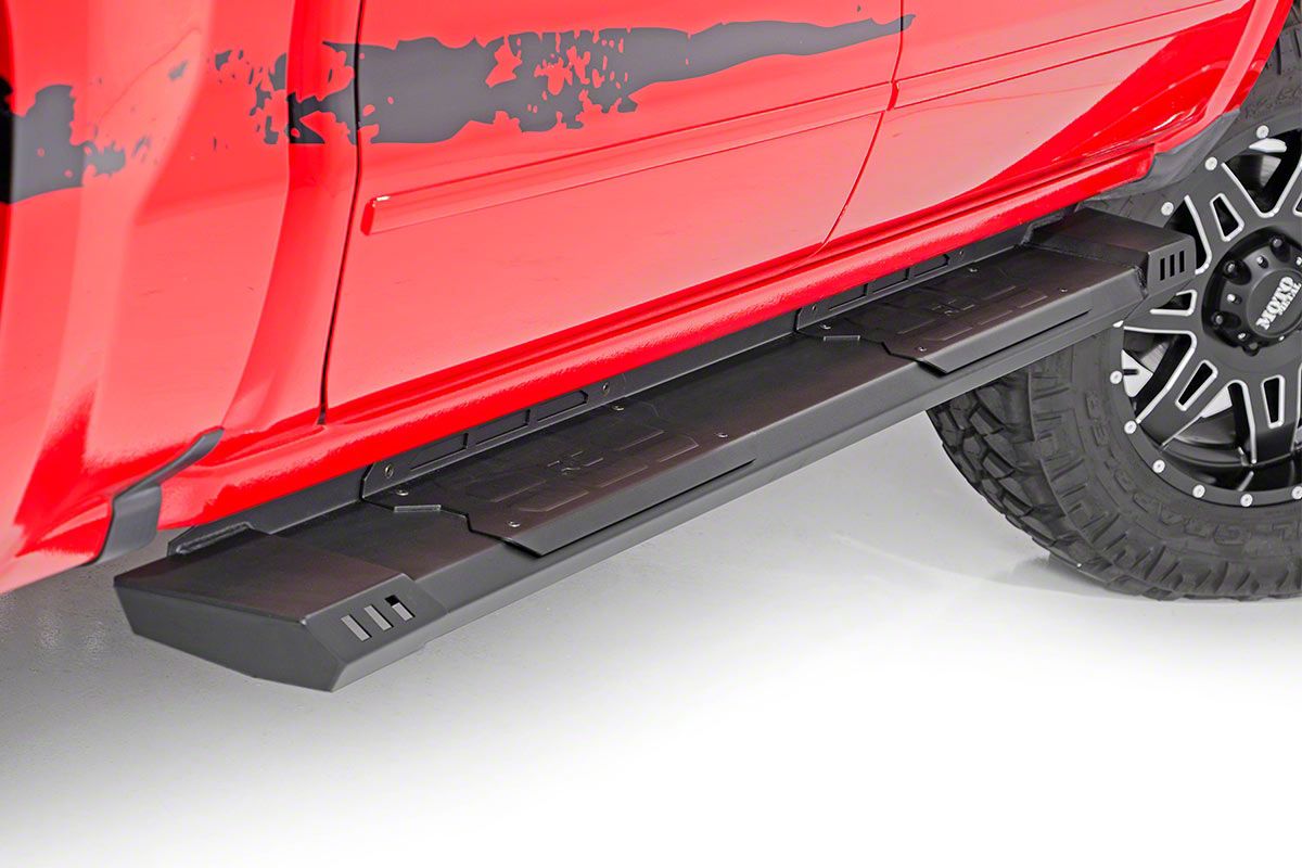 Access Your Truck in Style. If you’re looking for running boards that offer secure access while adding a lot of style to your Ford Super Duty truck, then Rough Country Black Cab Length HD2 Running Boards are what you need. These wider profiled running boards feature an angular "hi-tech" design that complements your truck’s muscular look in a more proportional manner. Likewise, this same wide profile gives you and your passengers a more stable footing for more secure cab access. Additionally, these boards all-steel construction provides rocker panel protection against road and trail hazards like rock shards, pebbles, and mud.