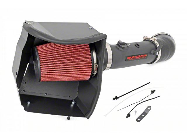 Composite Sheet Metal Assembly. The Rough Country Cold Air Intake is assembled from high-durability sheet metal and ABS plastic components that tightly seal incoming air, paired with a flexible silicone intake tube and quick-fix filter piece that effectively cleans the air as it passes into the manifolds.
