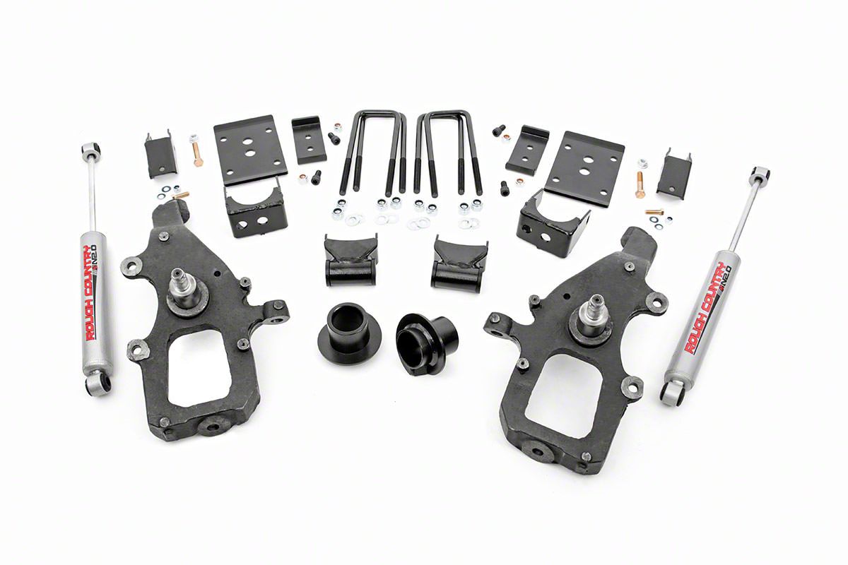 High Performance and Dynamic Stance. Rough Country offers the Lowering Kit with Premium N3 Shocks to give your F-150 a striking appeal with reinforced dynamics. This spindle lowering system provides 3-inch front and 5-inch rear drops for an enhanced balance of sportiness and comfort. It comes with premium-quality components that deliver optimum performance for a bolder on and off-road experience.