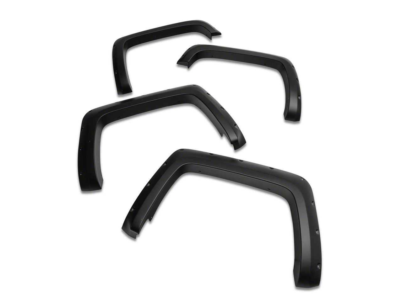 Durable Performance. This four-piece set of Rough Country Pocket Fender Flares - Flat Black provides excellent protection against off-roading hazards like mud, dirt, and rocks. You get 2 inches of tire coverage, along with eye-catching style that enhances your Sierra. These flares have riveted detailing for a tough appearance.