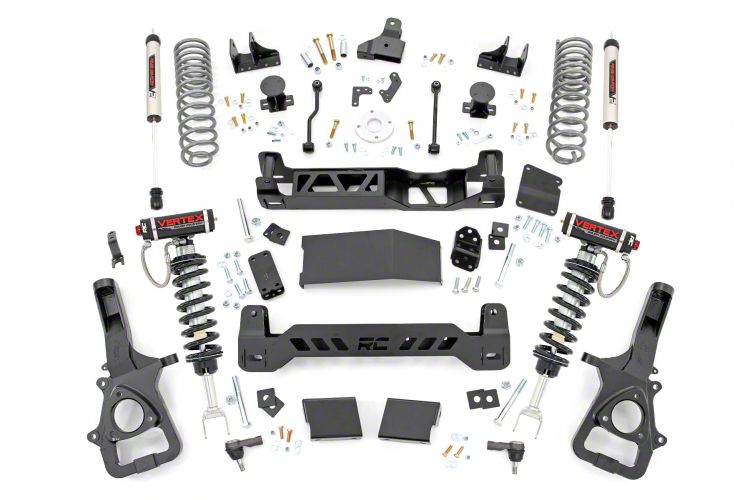 Improve Your Off-Roading Experience. Off-roading can be tough for your RAM’s stock suspension, that's why you need a lift kit that was specifically designed to take on the great outdoors. Luckily, this Rough Country Suspension Lift Kit has just what you need to help you drive over boulders, fallen logs, and other obstacles while on the trail. With 6-inches of lift, this kit can accommodate tires up to 35” x 12.5” in size mounted on 22-inch wheels. This Lift Kit features lifted steering knuckles as well as fabricated steel lift blocks and strut spacers for extra strength. What’s more, the included Vertex Adjustable Front Coilovers and V2 Monotube Rear Shocks provide a highly comfortable ride, even when tested across rough terrain.