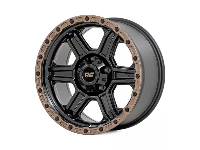 Rough Country 79 Series Semi Gloss Black with Bronze Ring 6-Lug Wheel; 18x9; -12mm Offset has a unique aesthetic appeal, combining a rugged finish with a sleek design. This striking design enhances the visual impact of any vehicle, making it a standout on the road. Perfect for those seeking a balance of toughness and style.