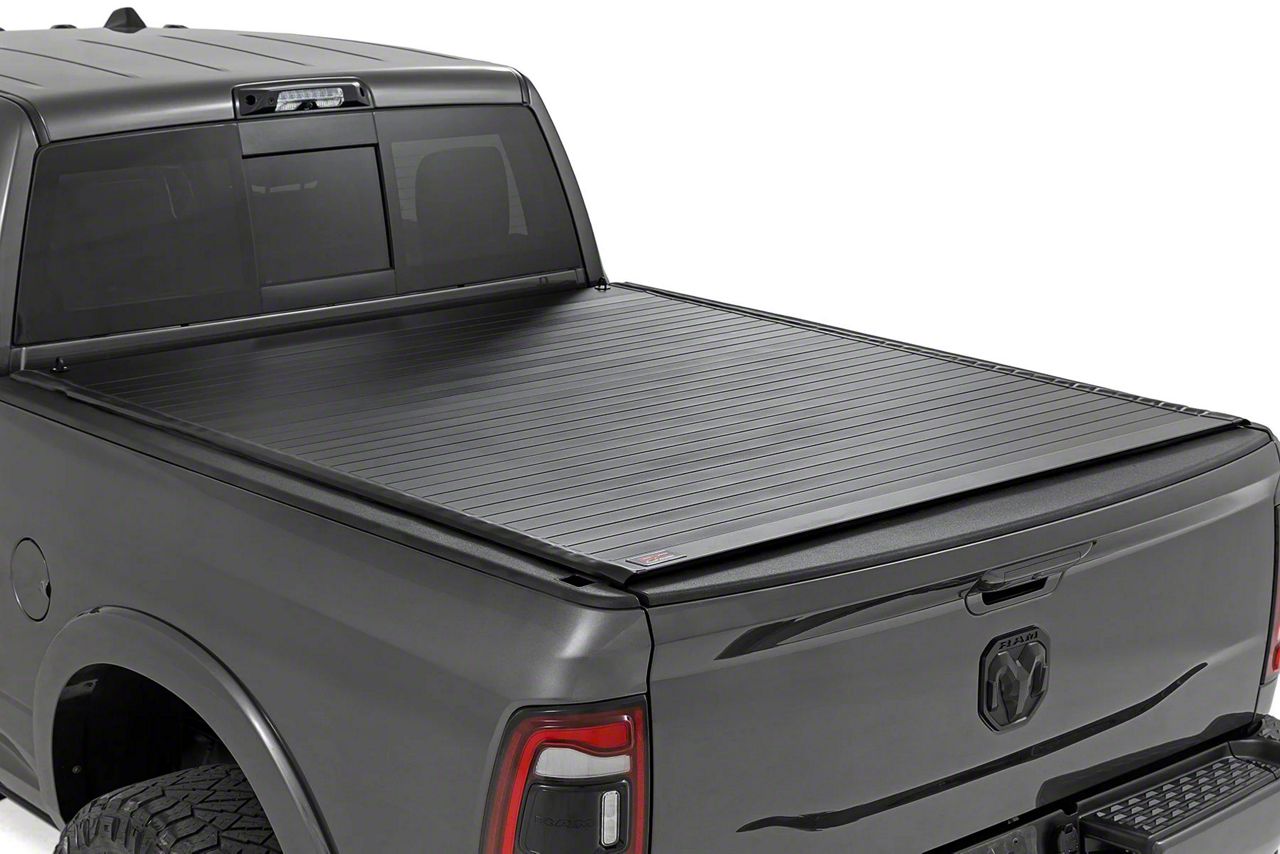 Secure and Sleek Bed Protection. The Rough Country Tonneau Cover offers a hard roll up design that enhances security, weather protection, and overall bed access for 2009-2018 Dodge RAM 1500 models with a 5.7-foot box (without RAM Box). Designed with a low-profile, flush-mounted style and matte black finish, it combines rugged functionality with a clean appearance, while offering full access to your truck bed when rolled up.