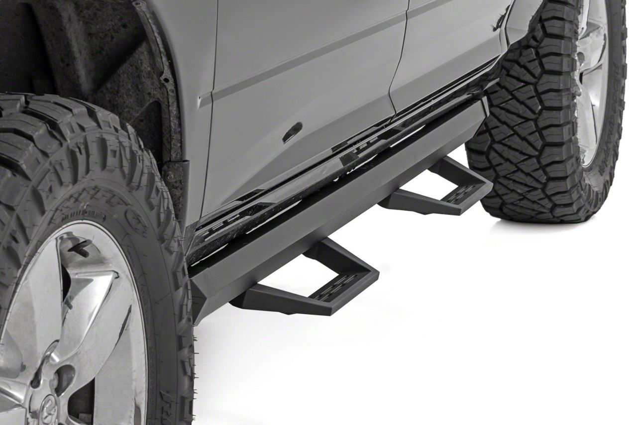 Durable Side Step Solution. The Rough Country SRL2 ADJ Side Step Bars provide a reliable and stylish way to enhance accessibility and protection for your Dodge RAM 1500 Crew Cab model. Furthermore, with their fixed-step design and modular construction, these side-step bars offer durability and convenience for everyday use and rugged conditions alike.