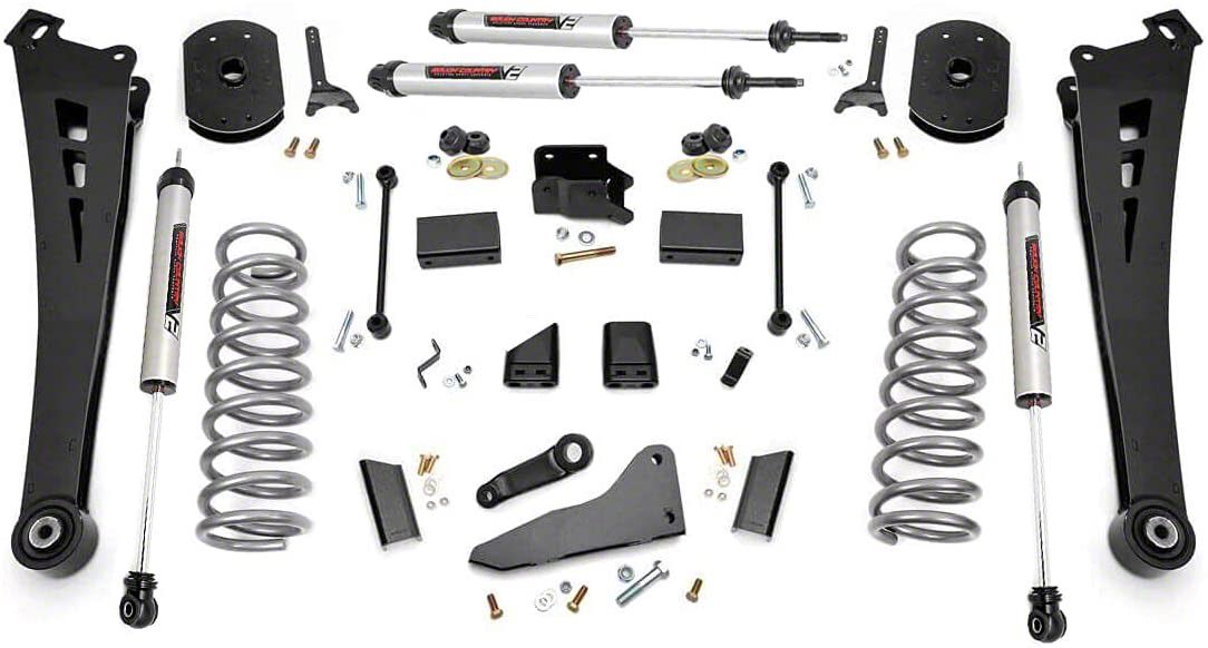 Keeps Factory Suspension Geometry. Bump up your RAM 2500’s performance by installing this Rough Country 5-Inch Radius Arm Suspension Lift Kit with Standard Rate Coil Springs and V2 Monotube Shocks. This lift kit has all the suspension components your truck needs. It raises your truck by 5 inches, giving better ground clearance and ride quality while maintaining the factory suspension geometry.