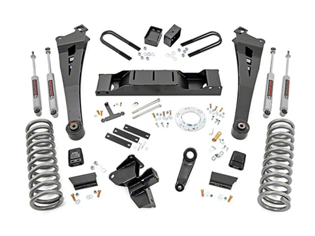 Reinforced Off-Roading. Maximize your RAM 2500’s off-roading capabilities by installing this Rough Country 5-Inch Radius Arm Suspension Lift Kit with Premium N3 Shocks. This lift system accommodates beefier tires and offers superior off-road driveability. It includes heavy-duty components to provide your truck with a bolder stance, improved handling, and smooth ride quality.