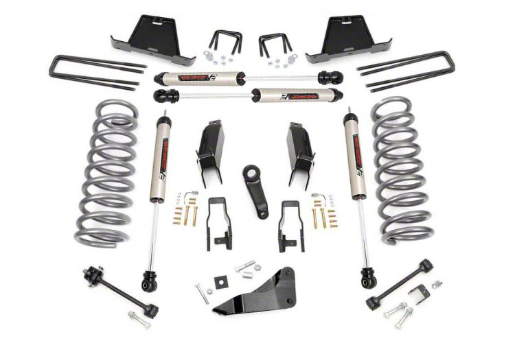 Construction and Features. This lift kit features a combination of raw metal, polished chrome, and matte black finishes for a rugged yet polished appearance. It includes V2 monotube shocks, control arm drop brackets, coils, U-bolts, and installation hardware. The vehicle-specific 10-stage variable velocity-sensitive valving ensures optimal stability and performance on and off the road.