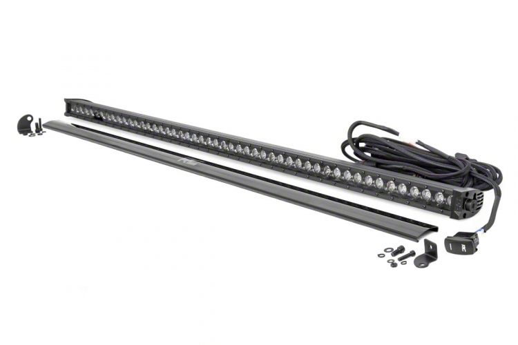 Cutting-Edge Features. Illuminate the road ahead like never before with the Rough Country 50-inch Black Series Single Row Cool White DRL LED Light Bar. This cutting-edge light bar features a sleek black panel design and a spot-beam pattern, perfect for focused, long-range lighting. With 48 high-intensity 5W CREE LEDs, it delivers an astounding 19,200 lumens output to light up even the darkest trails.