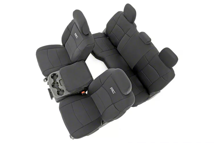 Stylish Seat Safety. Get a better look for your RAM 2500 with this Rough Country Neoprene Front and Rear Seat Covers; Black and preserve its factory style. It features a strong look that hugs your car seats tightly, giving it a new look while also saving the original factory quality of the stock fabric.