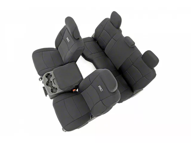Sleek Seat Styling. Keep your RAM 2500 looking sharp with this Rough Country Neoprene Front and Rear Seat Covers; Black. Expertly manufactured for a slim fit, it is precision fitted to the rest your stock seats, offering full shielding against stains and food and mud crumbs that could damage their original quality.