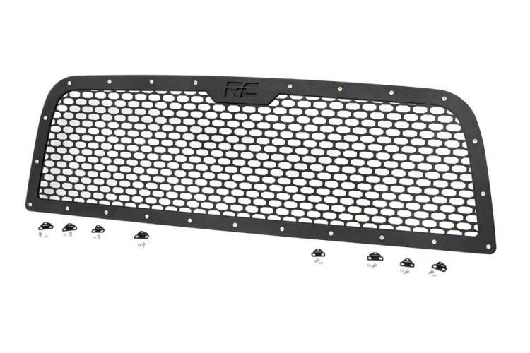 Mesh Power by Rough Country. The Rough Country Mesh Upper Replacement Grille; Black exemplifies utility and protection. Featuring a striking mesh pattern, it is also compatible with a factory grille mounted camera.
