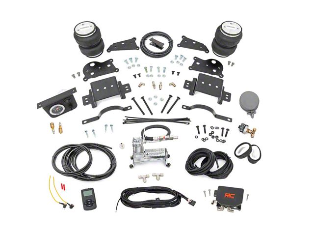 Convenient Inflation and Deflation. The Rough Country Rear Air Spring Kit's on-board air compressor allows for effortless inflation and deflation of the air springs directly from the comfort of your vehicle's cabin. This eliminates the need for external air sources, making adjustments quick and convenient on the go.