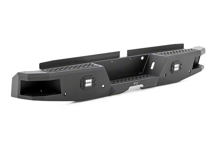 Rough Country Flush-Mount Cube Lights. Rough Country included a pair of its own Black series flush-mount cube lights with this rear bumper. These LED lights provide you with extra-bright illumination for better visibility. This is especially helpful when you’re tackling trails at night or dealing with bad weather. Moreover, these lights are flush-mounted so that the bumper face remains flat.