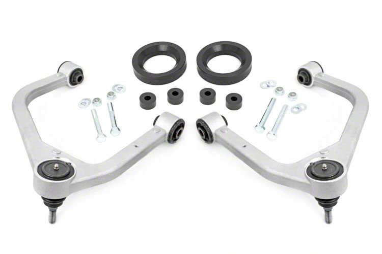 Concentrated Balance Control. Designed to provide a subtle yet effective lift to the front of your vehicle, this leveling kit is the ideal choice for eliminating the factory rake and achieving a balanced, eye-catching look. With an additional 1.75 inches of height in the front, you can say goodbye to the nose-down appearance and hello to a more commanding presence on the road.