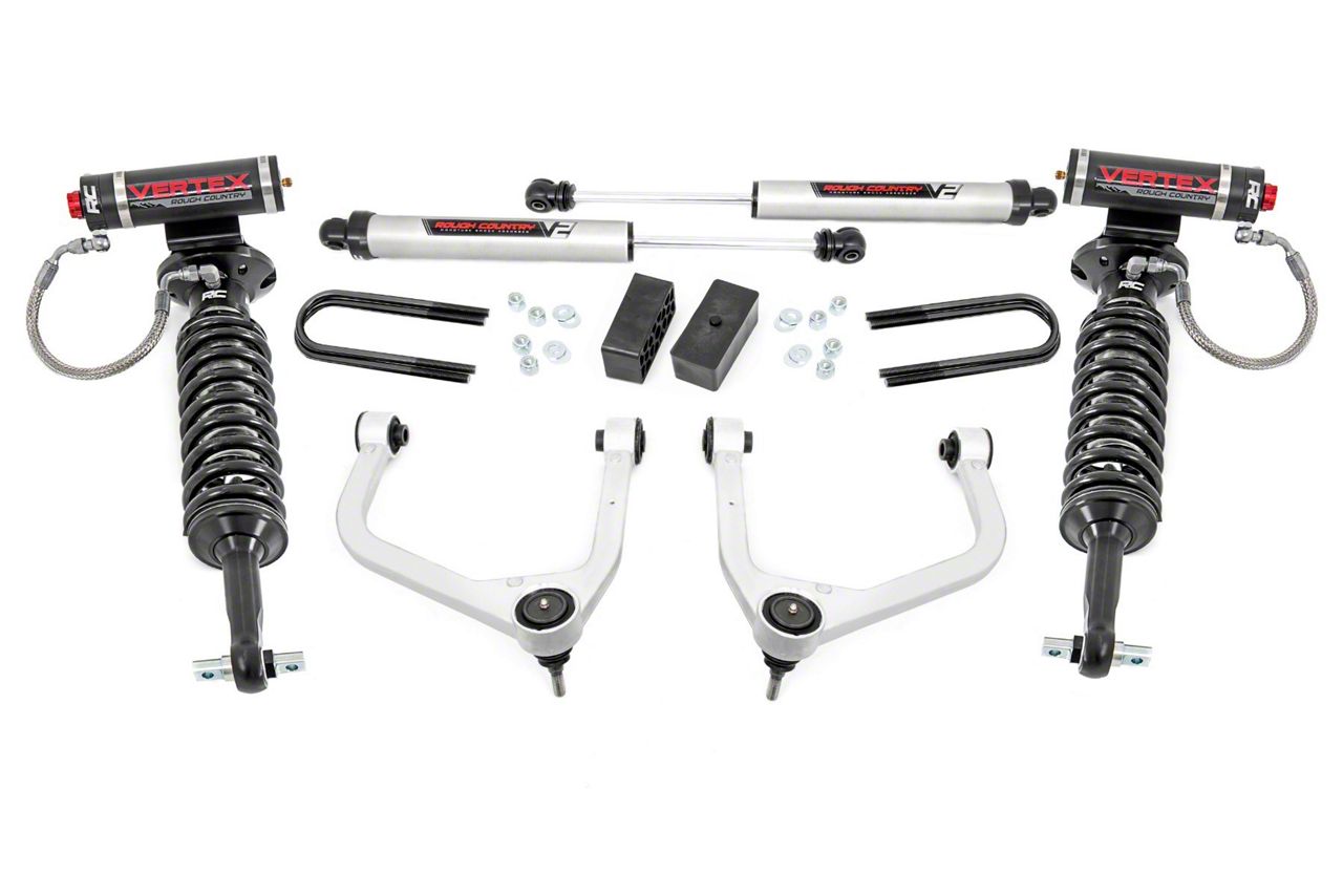 Superior Suspension Lift. The Rough Country Suspension 3.5-Inch Suspension Lift Kit with Vertex Adjustable Coil-Overs and V2 Monotube Shocks is designed to increase ground clearance and provide an aggressive stance for GMC Sierra 1500 trucks. This kit lifts the front 3.5 inches and the rear 2.5 inches, allowing fitment of tires up to 33 inches while maintaining balanced vehicle geometry and ride quality. It is ideal for off-road enthusiasts seeking enhanced terrain capability combined with refined ride comfort.