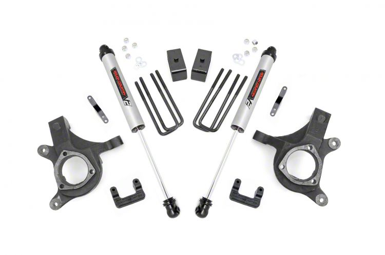 Get Remarkable Lift and an Aggressive Style. Look and feel good while conquering the harshest road conditions and toughest trails with the help of Rough Country’s 5-Inch Suspension Lift Kit with V2 Monotube Shocks. This kit has everything you need to raise your Sierra's ride height by 5 inches, as well as enhance its road damping performance and ride quality. As a result, your vehicle will not only gain a more commanding presence, but it’ll also have an easier time driving on rough roads.