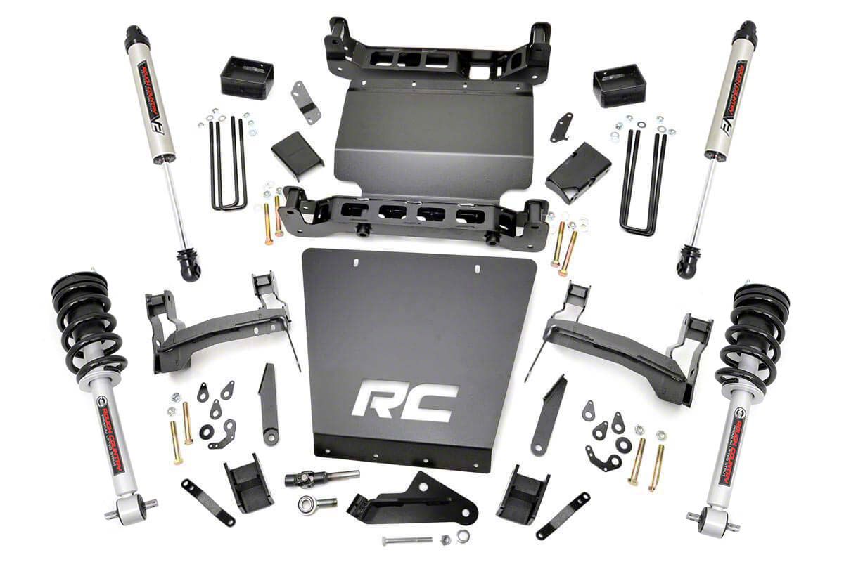Bolder All-Terrain Dynamics. Drive your Sierra on rougher terrains with the assurance that it can confidently crawl with optimum stability. Rough Country offers the 7-Inch Bracket Suspension Lift Kit with Lifted Struts and V2 Monotube Shocks for the rough off-roaders looking for optimum trail performance with street stability. This kit is designed to retain the stock track width and enables your truck to run up to an impressive, 35-inch tire on 20-inch wheels.