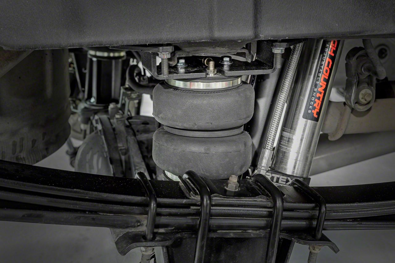 Enhanced Suspension Support. The Rough Country Suspension Air Spring Kit with Compressor for 4 to 6-Inch Lift is designed to provide dependable performance when towing, hauling, or driving under heavy loads. This kit levels your vehicle, helping to ensure stability and control while reducing sway and preventing bottoming out. It enhances safety and comfort, making it a reliable solution for drivers who demand strength and consistency in their suspension system.