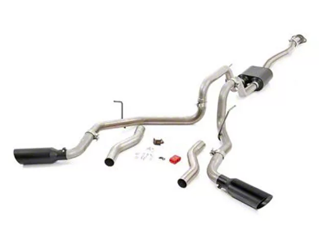Rough Country Dual Cat-Back Exhaust Systems feature a set of high-temp resistant, dual-wall 304 black stainless tips with RC logo for an improved, aggressive look. Upgrading your exhaust note has never been easier! Each kit conveniently installs onto the factory hangers and features stainless clamps for easy assembly with no welding required!