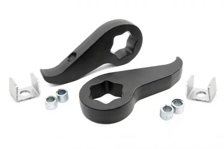 Highly Durable Construction. Rough Country designed these 1.50 to 2-Inch Leveling Torsion Bar Keys to reinforce your truck for aggressive adventures. Each of the torsion keys and shock extenders included in this leveling kit is built from a highly durable material. They’re also coated with a black powder-coated finish for a rugged look and lasting performance.