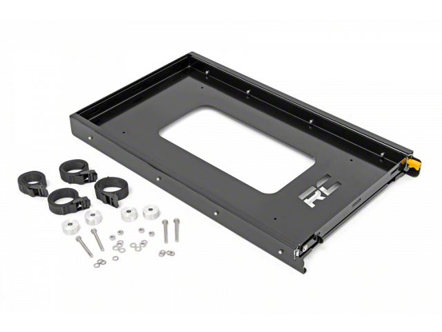 Simplified Cooler Holding. The Rough Country Cooler Sliding Tray is an accessory designed to make your outdoor adventures more convenient. It is a sturdy and durable metal tray that can hold a cooler of up to 48 quarts in size. The tray slides smoothly out of your vehicle's cargo area, making it easy to access your cooler without having to lift or move it around. The tray also features adjustable tie-down straps to keep your cooler securely in place during transport.