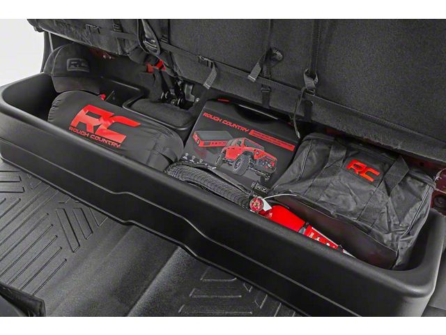 Description. Clean up the contents of your cab with Rough Country’s Custom-Fit Under Seat Storage Compartment. These handy under seat truck storage compartments offer an easy way to store your gear with a custom, contoured look that blends in seamlessly with your vehicle’s factory design. Keep your tools, gear, and other odds and ends organized and stowed away while conveniently stowed away under the rear seats.