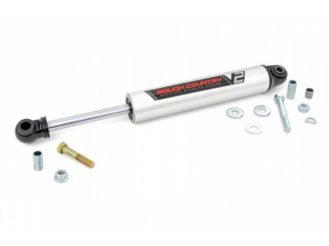 Description. Superior Design and Comfort. Give yourself peace of mind when upgrading to a larger wheel and tire set up with Rough Country's V2 stabilizers! Steering stabilizers are designed to restrain "bump steer" and front-end vibration, giving added life to tires, ball joints, and other steering components. Rough Country's V2 stabilizers improve the overall driving experience providing precise dampening raising the vehicle's overall comfort and functionality.