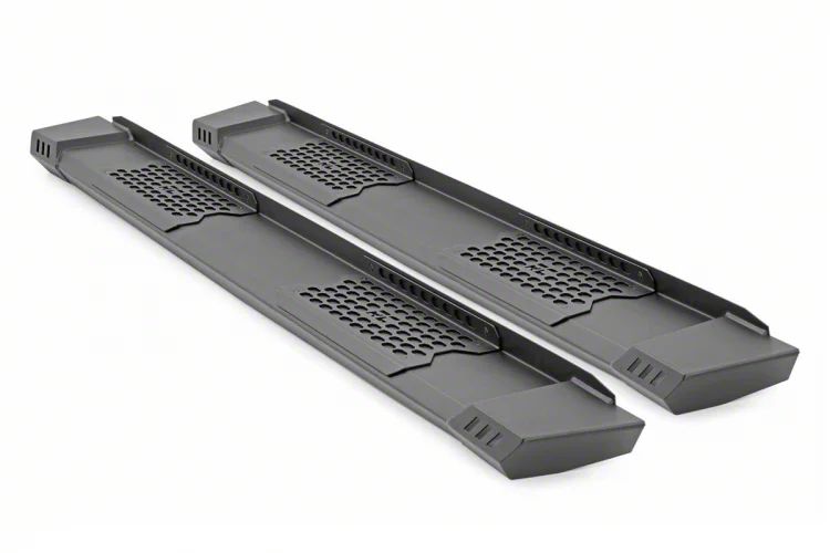 Steel Construction. These Rough Country HD2 Running Boards are manufactured from heavy duty, carbon steel for superior strength and durability. A high-grade, textured black powder coated finish is then applied for aggressive good looks and long-lasting corrosion resistance. As part of the final assembly a set of rugged, non-slip step pads with the “RC” logo are installed.