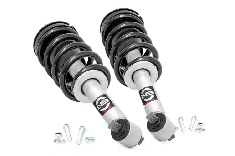 Durable Construction and Precise Engineering. Rough Country ensures the reliable functionality of this pair of N3 Front Struts by using heavy-duty materials. The massive bore offers increased oil capacity for improved ride quality and the durable pistons, chrome-hardened piston rods with leak-proof seals deliver optimum performance. Moreover, the struts come in a black powder-coated finish that adds an appealing highlight to your suspension system and enhances your truck’s stance.