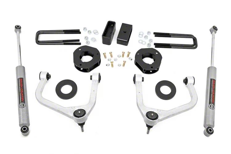 Reinforced Ground Dynamics. Let your Silverado conquer the great outdoors by installing the Rough Country 3.5-Inch Suspension Lift Kit with Upper Control Arms. This lift system includes well-engineered components to ensure more stability and control on your rough off-road adventures. The kit comes with heavy-duty upper control arms, premium N3 shocks, fabricated rear lift blocks, rear U-bolt lift kit, and a differential skid plate.