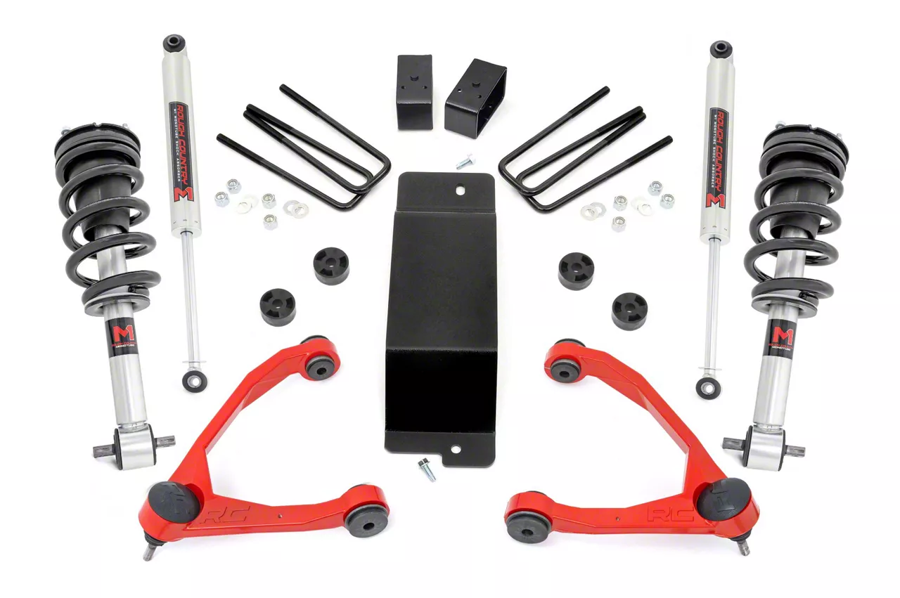 Upgrade Your Ride with Precision. Elevate your Silverado 1500's performance and stance with the Rough Country 3.50-Inch Forged Upper Control Arm Suspension Lift Kit, featuring state-of-the-art V2 Monotube Shocks in a striking red powder-coat finish. This comprehensive lift kit raises your truck by 3.5 inches, allowing for increased ground clearance and the ability to fit larger tires for a more aggressive look.