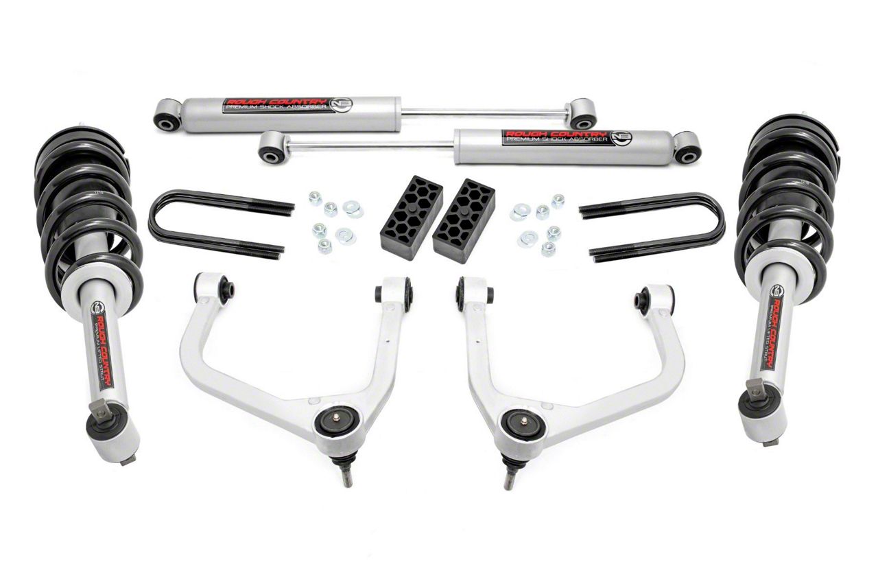 Enhanced Ride Quality. The Rough Country Suspension 3.50-Inch Suspension Lift Kit with Premium N3 Struts and Shocks is designed to elevate both the stance and performance of your truck. By lifting the front and rear, it creates a leveled profile while giving the vehicle a more aggressive appearance. This suspension kit is built for drivers who want improved handling, ground clearance, and room for larger tires, making it a valuable upgrade for on-road comfort and off-road capability.
