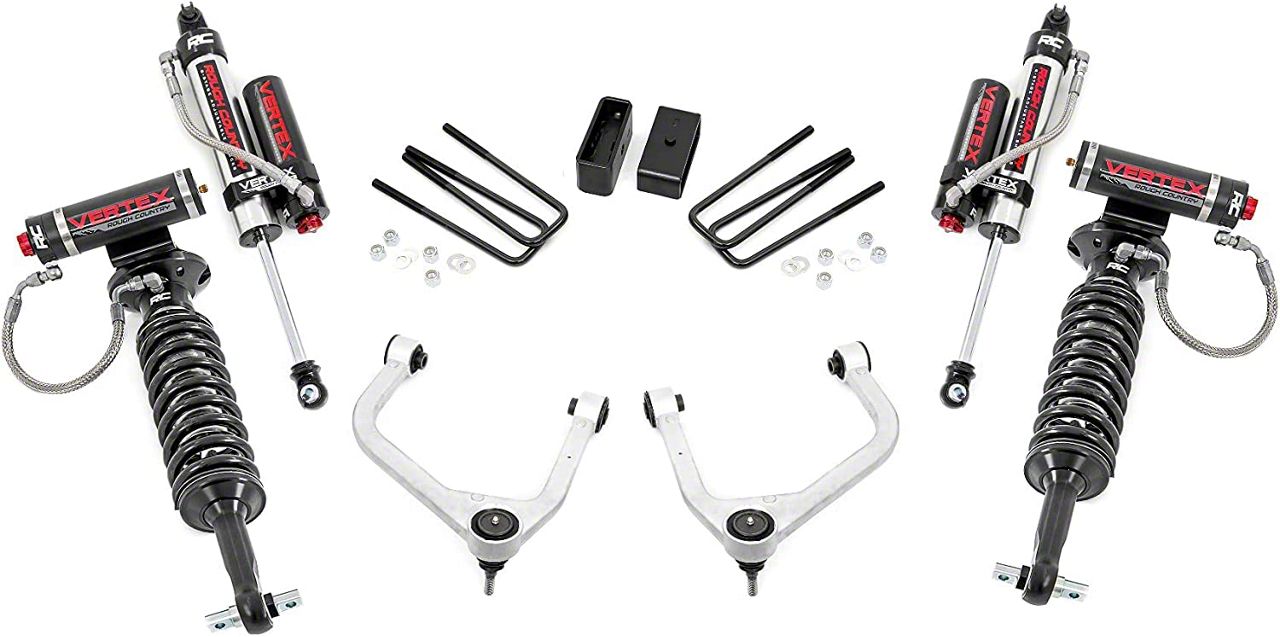 Control Arm Kit. This Rough Country 3.50-Inch Forged Upper Control Arm Suspension Lift Kit with Adjustable Vertex Coil-Overs and Vertex Shocks gives your truck the proper suspension geometry. You'll increase ground clearance and get your front 3.50 inches and the rear 2.50 inches.