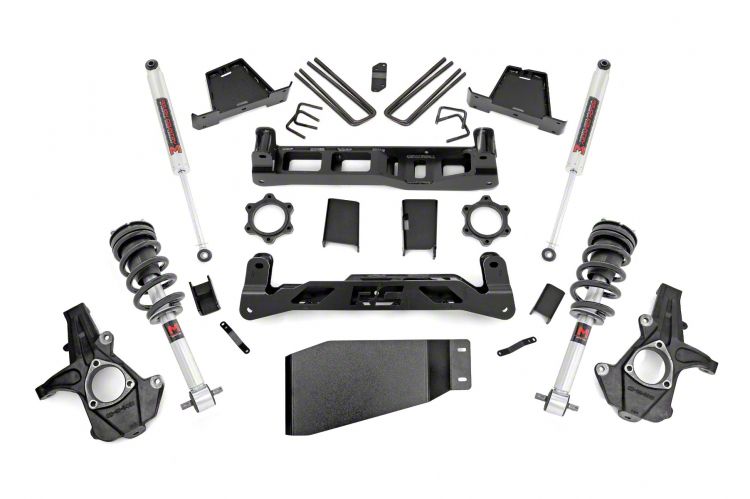 Excellent Functionality. The Rough Country 7.50-Inch Suspension Lift Kit is a powerful upgrade designed to give your vehicle a commanding presence on and off the road. With a generous 7.5 inches of lift, it dramatically increases ground clearance, allowing you to conquer even the most challenging terrains with ease. This kit also grants the flexibility to run up to 35-inch tires on factory 20-inch wheels, giving your vehicle a rugged and aggressive appearance while improving its off-road capabilities. What's more, the suspension lift ensures a level stance, providing not only enhanced aesthetics but also improved handling and stability during your adventures.