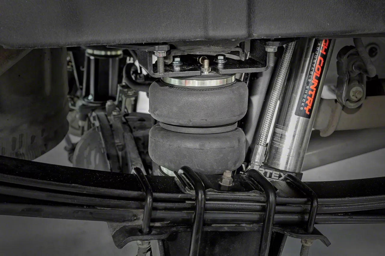 Enhanced Suspension Support. The Rough Country Suspension Air Spring Kit with Compressor for 2 to 3.50-Inch Lift is designed to provide reliable load-leveling support. This system helps reduce trailer sway, prevents bottoming out, and improves overall handling when towing or carrying heavy loads. By maintaining a leveled stance, it ensures safer and more comfortable driving under a variety of conditions.