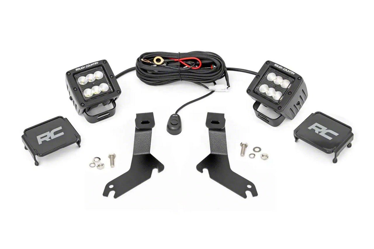 Enhanced Truck Lighting. The Rough Country Suspension Black Series LED Ditch Light Kit; Flood Beam provides powerful side illumination to improve nighttime visibility and enhance safety while driving. Designed to mount on the hood hinge area, these lights are adjustable to direct light exactly where needed and are ideal for off-road conditions or low-light environments.