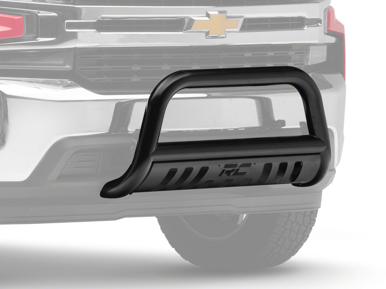 Beefed-Up Front-End Protection and Functionality. Drive with extra confidence by installing this Rough Country Bull Bar in Black. This aftermarket accessory is ready to defend your front end with its large 3-inch diameter steel tube body. Featuring die-cut accents with the “RC” logo prominently displayed, this bull bar also provides an aggressive look to your already powerful-looking Chevy Silverado.