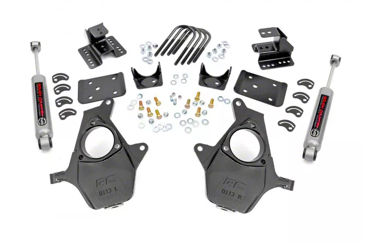 Improved Handling and Style. Outfitting your street-focused Silverado 1500 with a lowering kit is a great way to improve both its handling and style. When choosing the right lowering kit for your ride, this Rough Country Knuckle Lowering Kit; 2-Inch Front / 4-Inch Rear is the way to go. This lowering kit will drop your front by 2 inches and rear by 4 inches lowering your center of gravity while also leveling out the front to the rear. The result is more stable handling and a fierce leveled stance. Likewise, this kit achieves its lowered ride height while retaining a smooth factory ride quality so your truck not only looks good, it drives brilliantly as well.