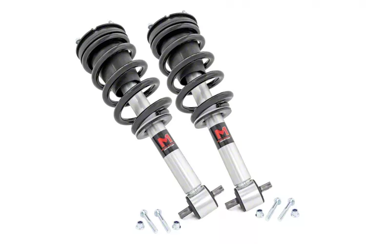 Empowered Vehicle Stability. Enhance your vehicle's performance and stability with the Rough Country M1 Loaded Front Struts. These high-quality struts are designed to provide exceptional durability and reliability, ensuring optimal performance and longevity. Constructed from processed billet aluminum, these struts are lightweight yet sturdy, with superior strength and rigidity that can withstand even the toughest road conditions.