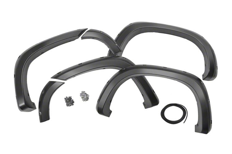 Strong Street Look. Transform the appearance and functionality of your Silverado 1500 with the Rough Country Pocket Fender Flares; Flat Black. These fender flares are designed to add style, protection, and extra tire coverage to your truck, making them perfect for off-road enthusiasts and anyone looking to upgrade their vehicle's exterior.