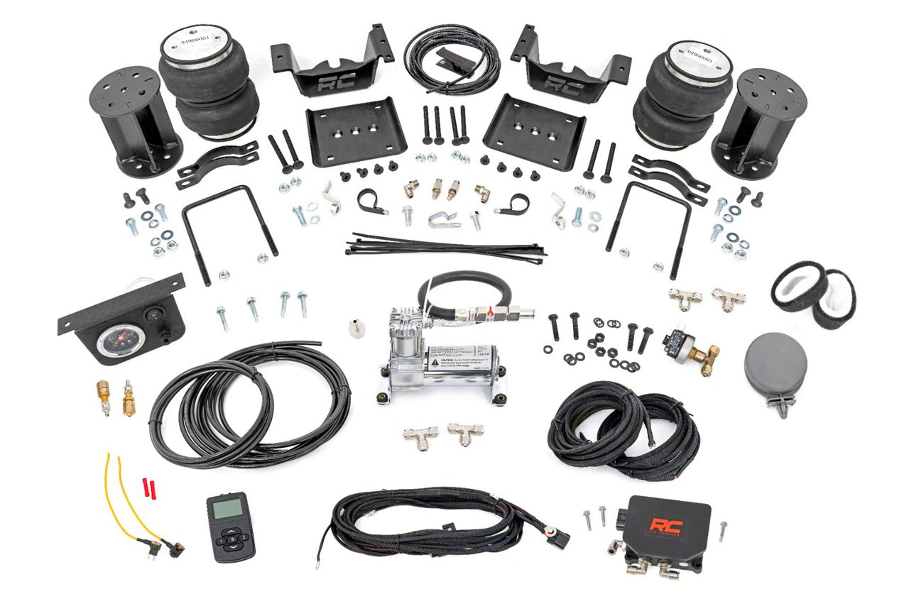 Enhanced Suspension Control. Elevate the functionality of your Silverado 1500 with the Rough Country Rear Air Spring Kit with OnBoard Air Compressor and Wireless Remote for 0 to 6-Inch Lift; 12 to 13-Inch Range. Equipped with an onboard air compressor, this kit allows for convenient and quick adjustments to the air springs. The compressor is powerful, reliable, and neatly integrates with your truck's systems. For maximum convenience, this air spring kit comes with a wireless remote, enabling you to adjust the air pressure from the comfort of your driver's seat or from a distance.