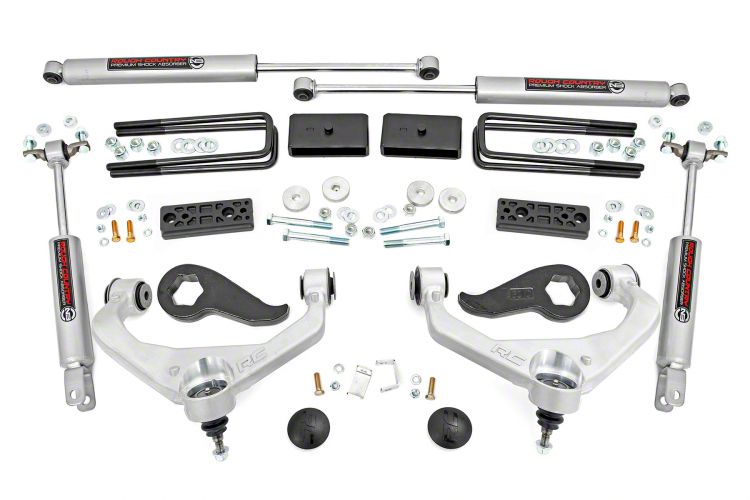 Excellent Functionality. The Rough Country 3-Inch Bolt-On Suspension Lift Kit is a comprehensive upgrade that provides a 3-inch lift for your vehicle. With this increased lift, you gain more ground clearance, allowing you to tackle challenging off-road terrains with confidence. One of the advantages of this lift kit is that it maintains the factory track width, ensuring proper alignment and handling characteristics. Additionally, it retains the OEM ride quality, meaning you can enjoy a smooth and comfortable driving experience both on and off the road.
