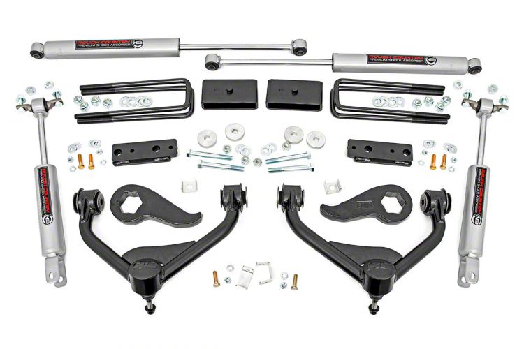 Bolder Off-Roading. Give your Silverado 2500 HD a more aggressive look and reinforced off-road performance while maintaining a smooth on-road ride quality by upgrading to this Rough Country 3-Inch Bolt-On Suspension Lift Kit with Premium N3 Shocks. With this suspension lift kit, you can run up to 35-inch tires on your truck with the enhanced ground clearance. This lift system also comes with heavy-duty upper control arms, torsion keys, N3 shocks, rear blocks, and U-bolts for a bolder all-terrain performance.