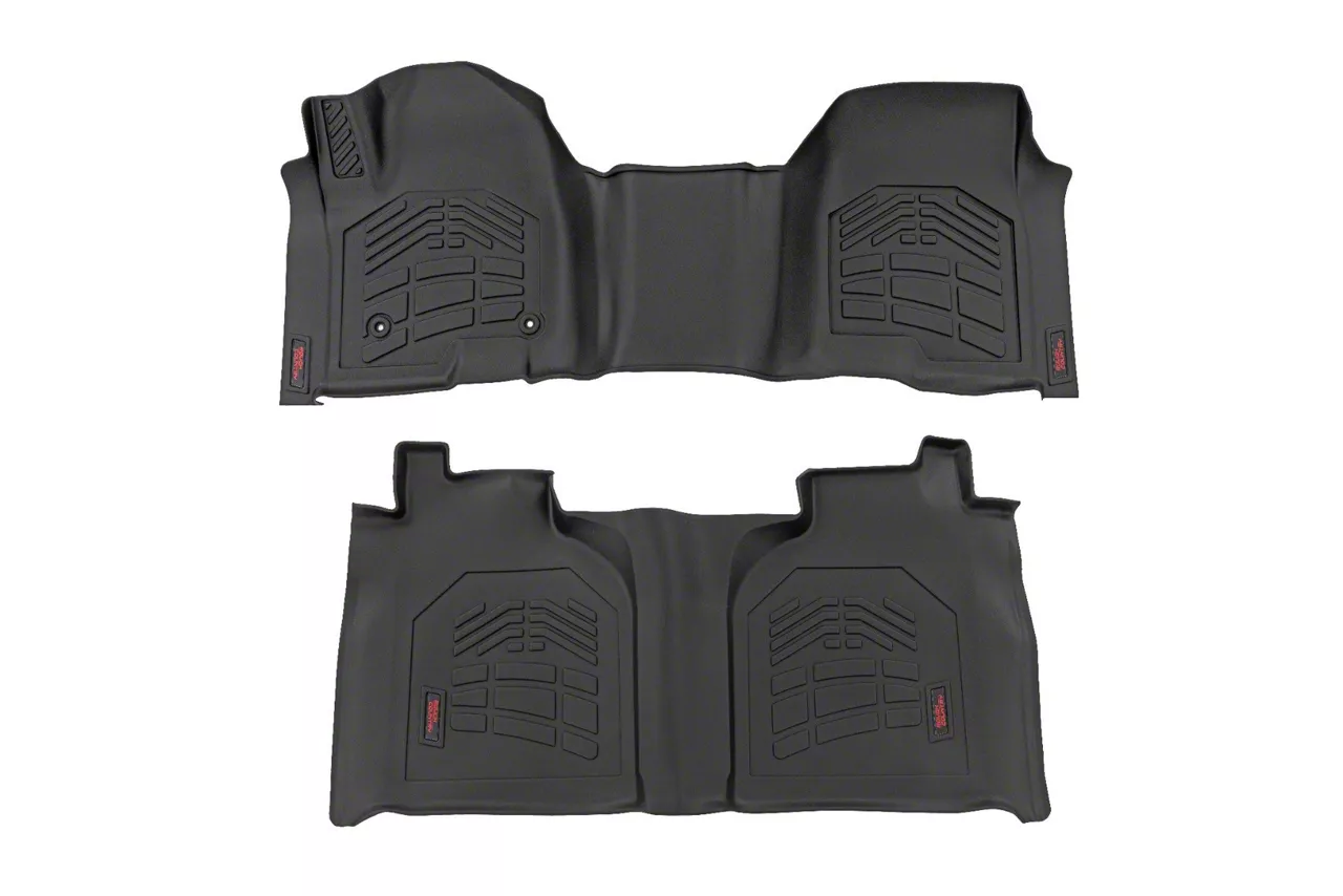 All-Weather Floor Protection. The Rough Country Sure-Fit Front and Rear Floor Mats provide complete interior protection against dirt, mud, spills, and daily wear. Designed with a custom-molded fit, these mats offer full coverage for both the front and rear floor areas, ensuring that your Silverado's carpet remains clean and well-preserved.