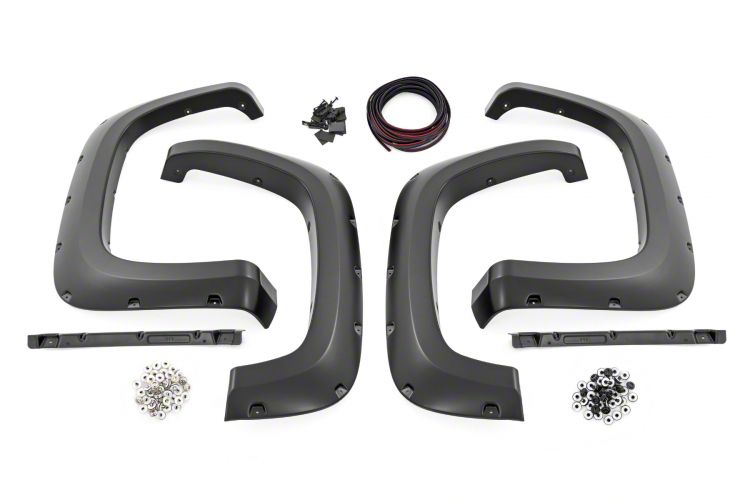 Construction and Features. Crafted for durability and style, these Rough Country Pocket Fender Flares feature a simulated riveted look for a bold, aggressive aesthetic. The UV-treated construction ensures long-lasting resistance against fading and cracking, making them ideal for tough environments. Designed to protect your truck’s bodywork, these flares combine form and function to perfection.