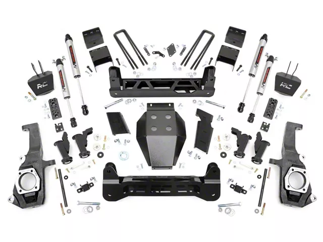 Construction and Appearance. This Rough Country 7.50-Inch Torsion Drop Suspension Lift Kit with V2 Monotube Shocks is engineered using heavy-duty steel and precision-machined components built to handle extreme stress and rugged terrain. The V2 Monotube Shocks offer consistent damping and performance. All parts feature a corrosion-resistant finish, ensuring long-lasting durability and a sleek, aggressive appearance.