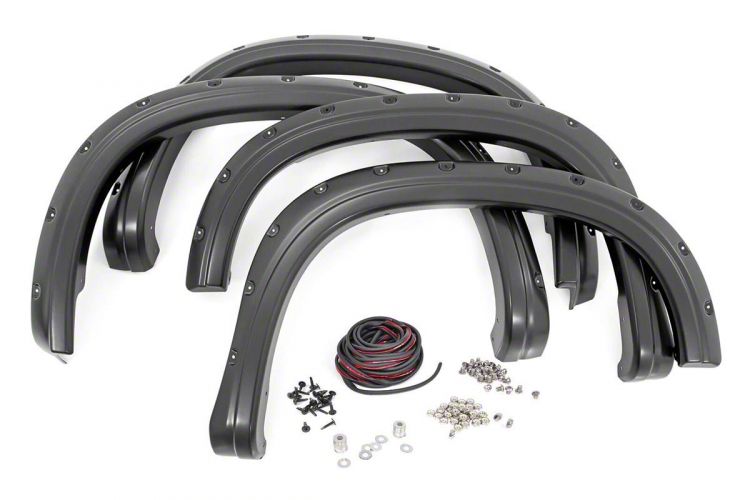 New Look. Let your Chevy sport a new look by adding these Flat Black Rough Country Pocket Fender Flares. These accessories are built with a simulated riveted design, allowing your truck to show off a more aggressive stance. What’s more, these fender flares help hide the existing blemishes of your truck’s wheel well area while boosting the protection of your wheel well components against kicked-up debris.